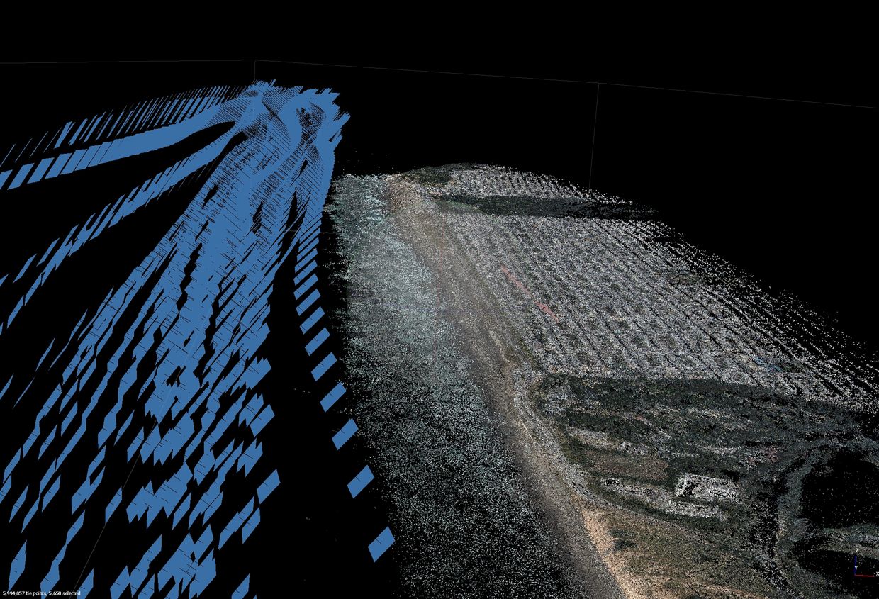To get the raw data for SfM, a plane or drone captures overlapping photos of a stretch of coastline.
